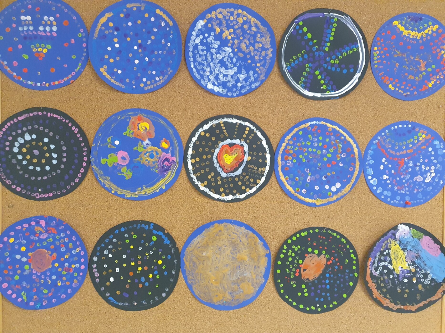 Na czarnym i granatowym papierze dzieci projektowały swoje kropki, tworząc barwne i pomysłowe kompozycje. Do malowania wykorzystały nietypowe narzędzie – patyczki do uszu, dzięki czemu powstały oryginalne i efektowne wzory.