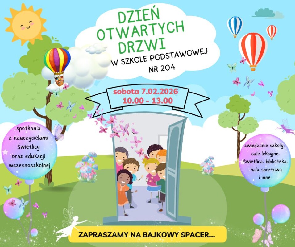 w dniu 07.02.2026r. w godz. 10.00 - 13.00 zapraszamy na Dzień Otwartych Drzwi w Szkole Podstawowej nr 204.