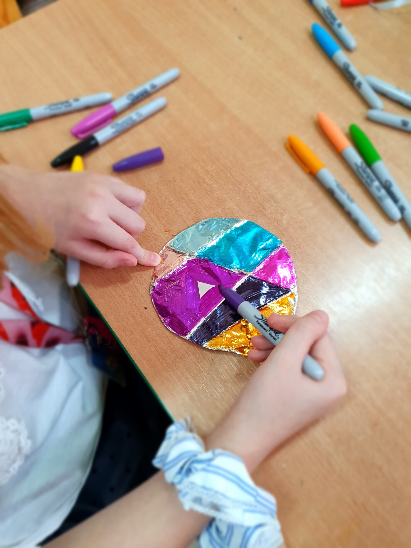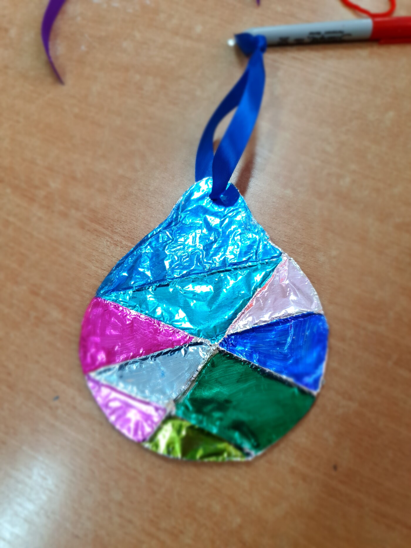 Kolejnym zadaniem było wykonanie bombek w witrażowej odsłonie. Uczniowie stworzyli oryginalne ozdoby z kartonu, sznurka oraz folii aluminiowej. Kartonowe formy były obwiązywane sznurkiem, a następnie owijane folią, co pozwoliło uzyskać wyraźne kontury przypominające linie witrażu. Następnie bombki zostały pomalowane flamastrami dzięki czemu powstały barwne, efektowne prace pełne światła i kontrastów.