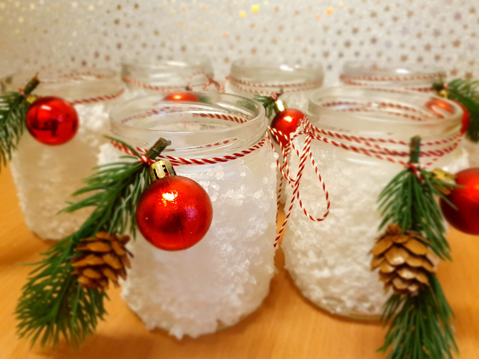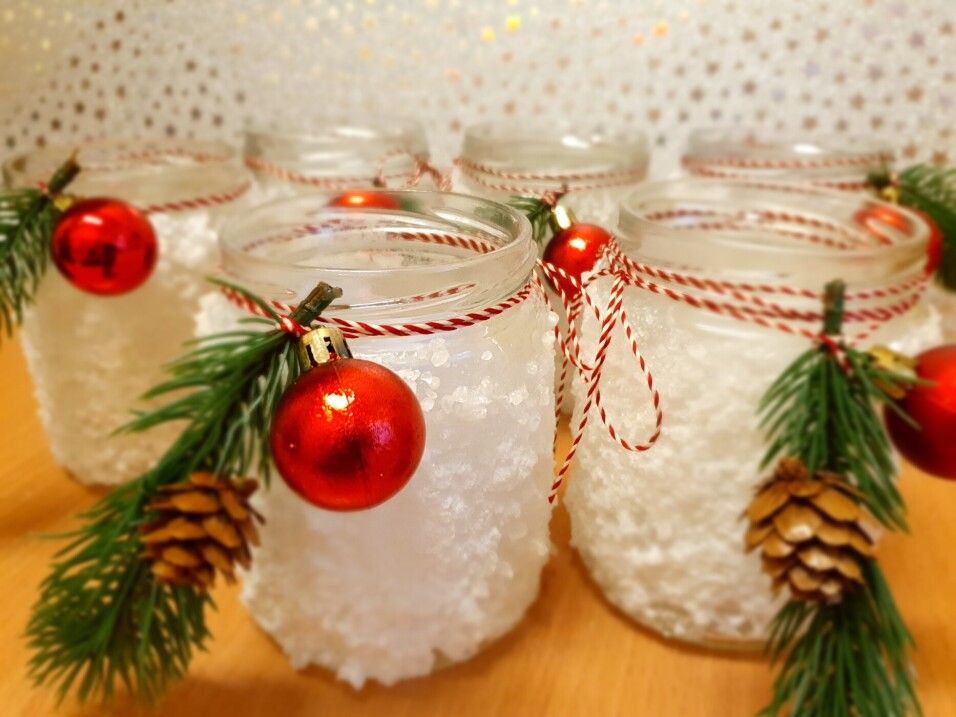 W ramach pierwszych zajęć wykonali solne lampiony. Praca rozpoczęła się od dokładnego pokrycia szklanych słoików klejem, a następnie starannego obsypywania ich powierzchni solą. Po wyschnięciu powstała dekoracyjna faktura przypominająca szron. Następnie lampiony zostały ozdobione sznureczkiem, świerkową gałązką oraz bombką, nadając im wyjątkowy, świąteczny charakter.