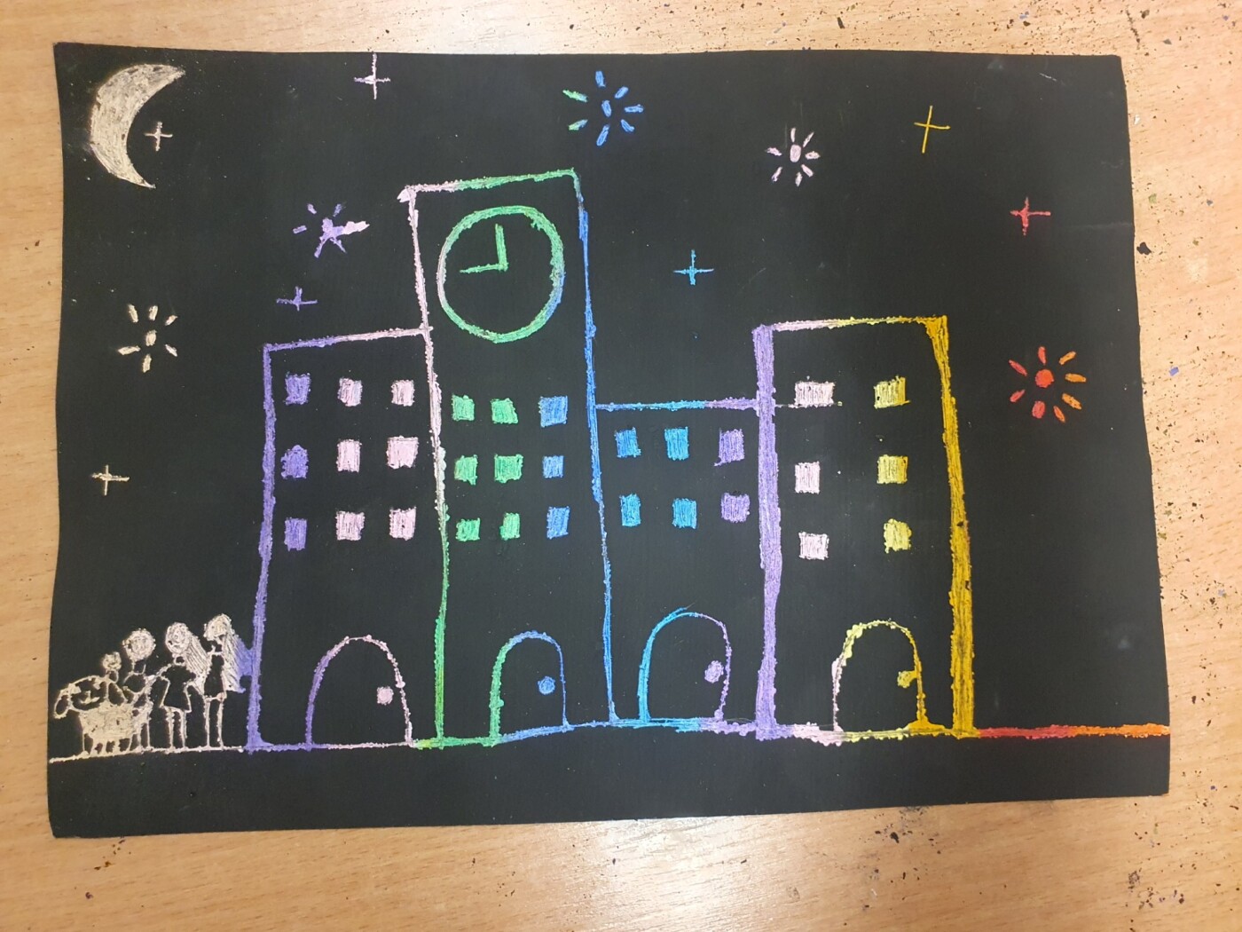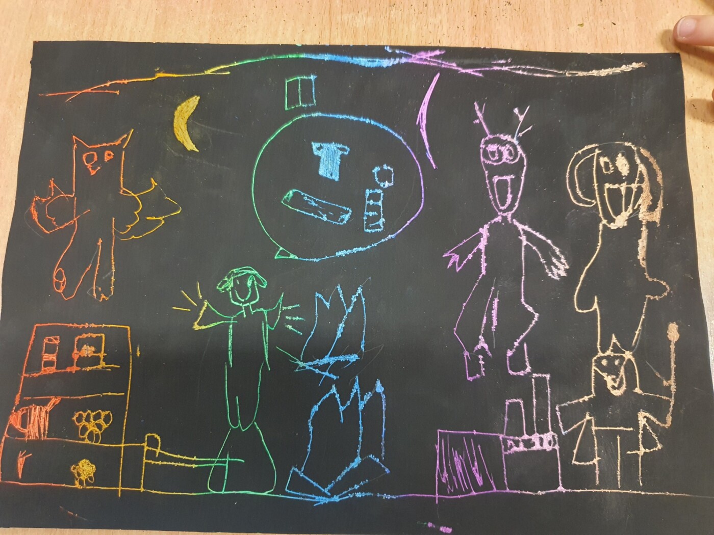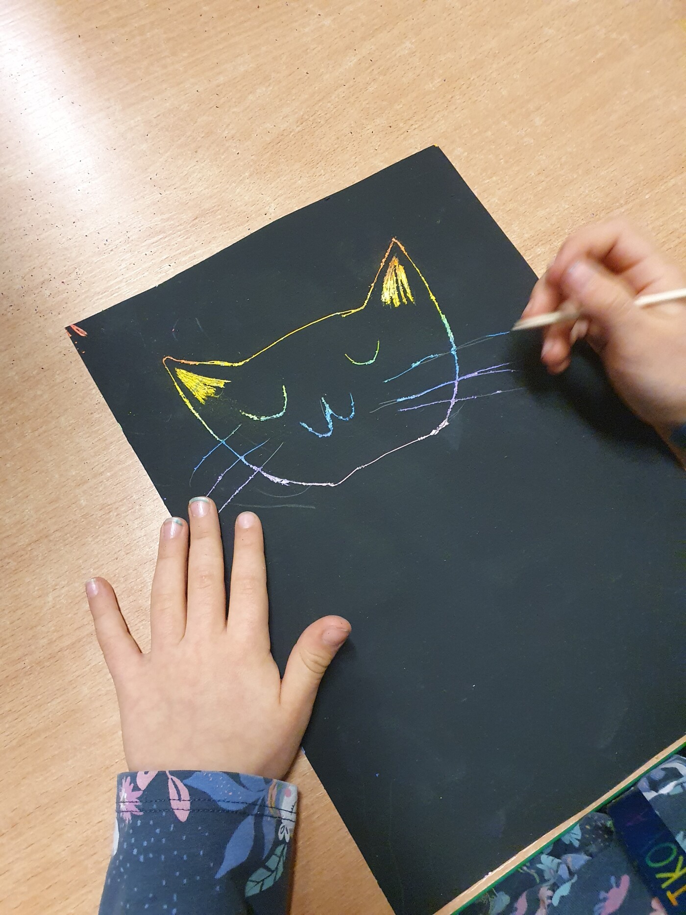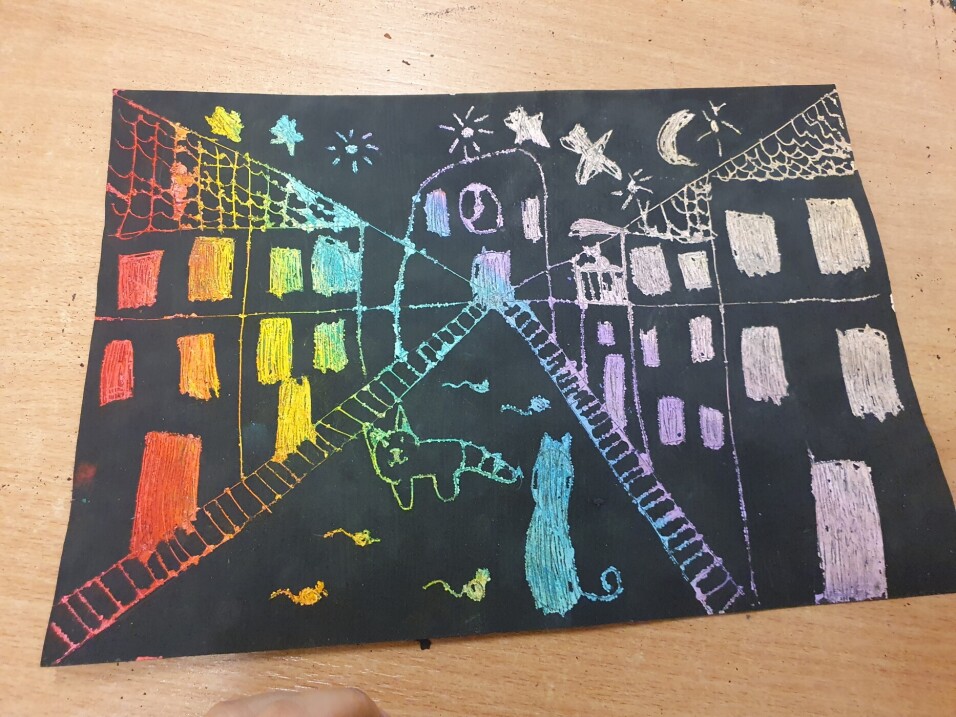 Podczas zajęć koła plastycznego „Radość tworzenia” uczniowie mieli okazję poznać ciekawą i efektowną technikę plastyczną – wydrapywankę. Każdy uczestnik samodzielnie przygotował swoje podłoże do pracy. Na białą kartkę brystolu dzieci dokładnie naniosły grubą warstwę tłustych pasteli w wyrazistych kolorach. Następnie całość została starannie pokryta czarną farbą. Gdy farba wyschła, rozpoczęła się najciekawsza część pracy – wydrapywanie obrazków za pomocą patyczków szaszłykowych. Z pomocą delikatnych ruchów uczniowie odkrywali spod czarnej powierzchni ukryte, barwne kolory. Na kartkach powstawały oryginalne obrazki - m.in. koty, miasto nocą czy postacie z gier.