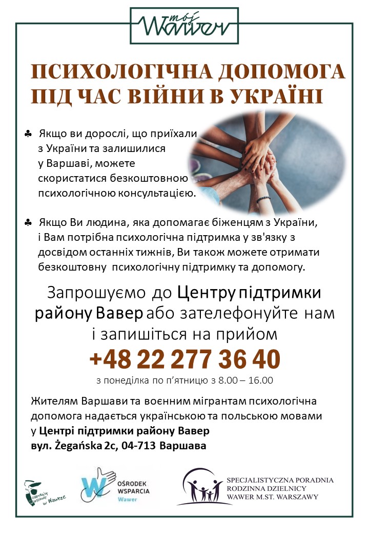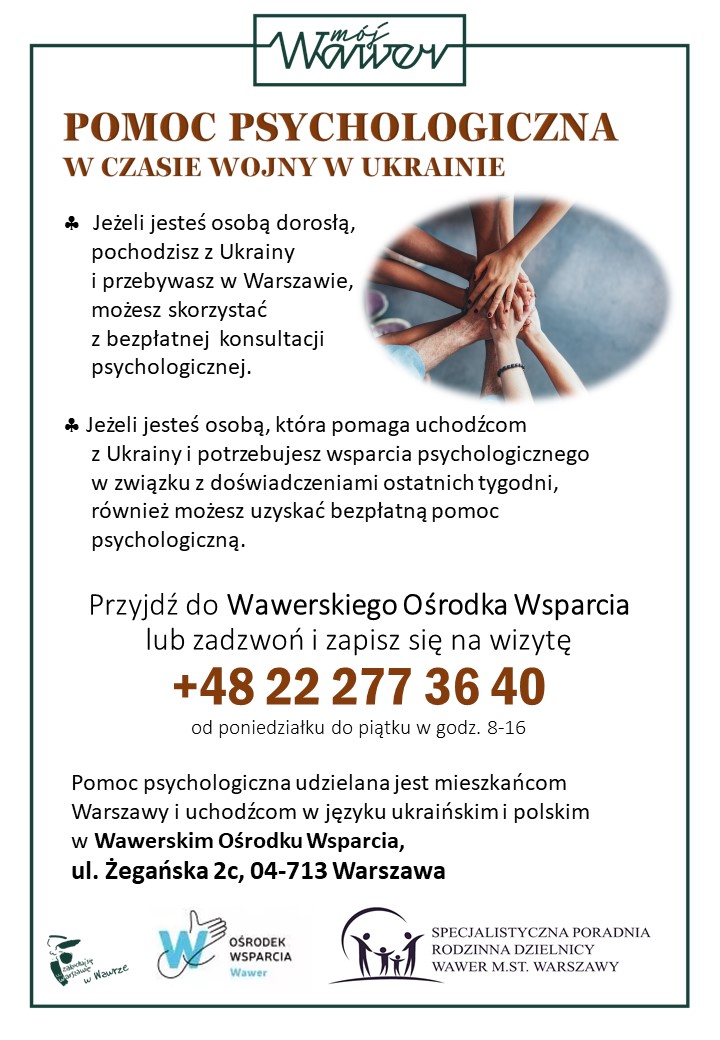 W załączniku znajdują się materiały promocyjne dot. pomocy psychologicznej w Wawerskim Ośrodku Wsparcia na Żegańskiej.